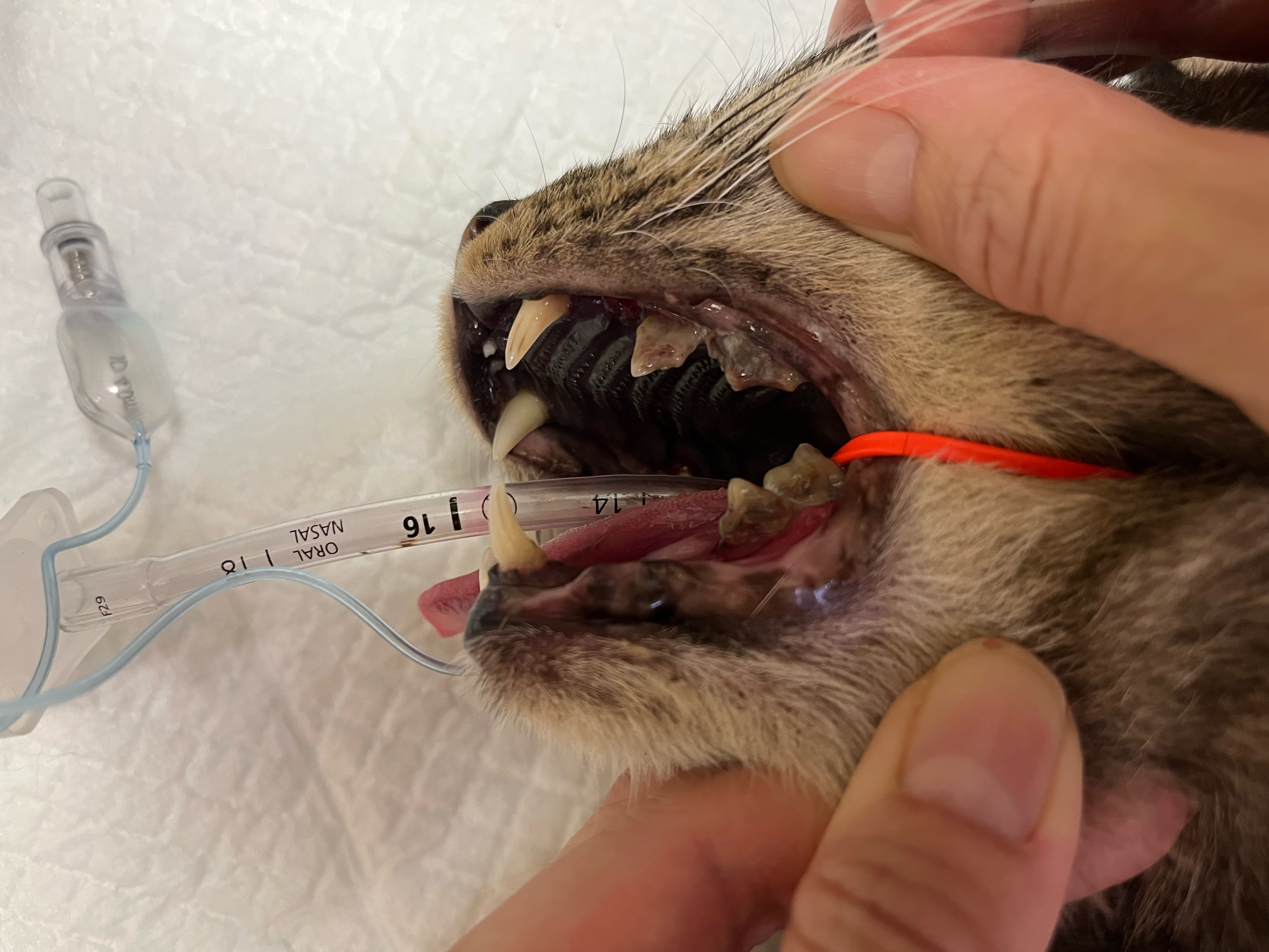 重度歯周病と口内炎の為、歯石除去と抜歯処置の日帰り手術と鼻腔洗浄を行った5歳ミックス猫の男の子
