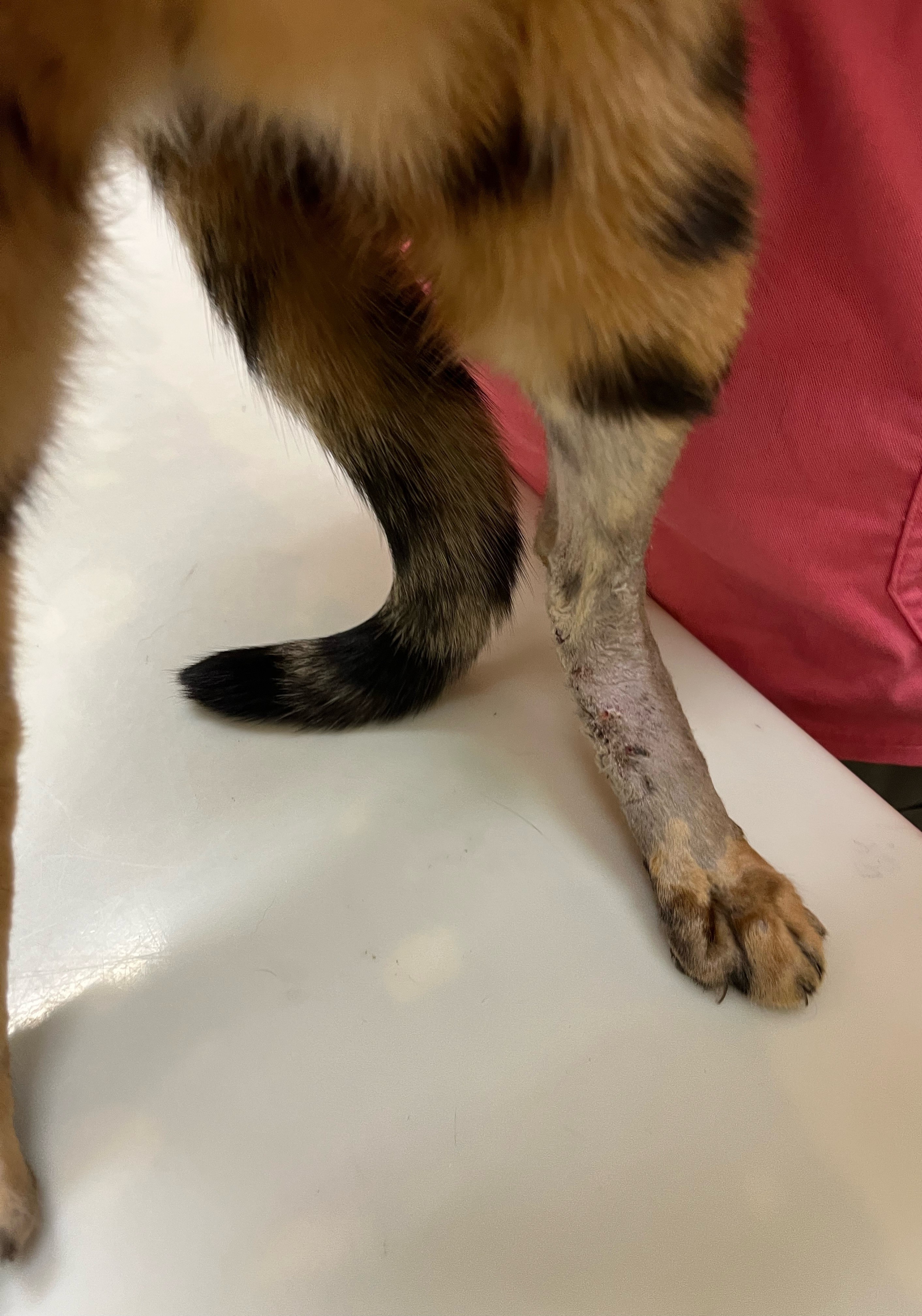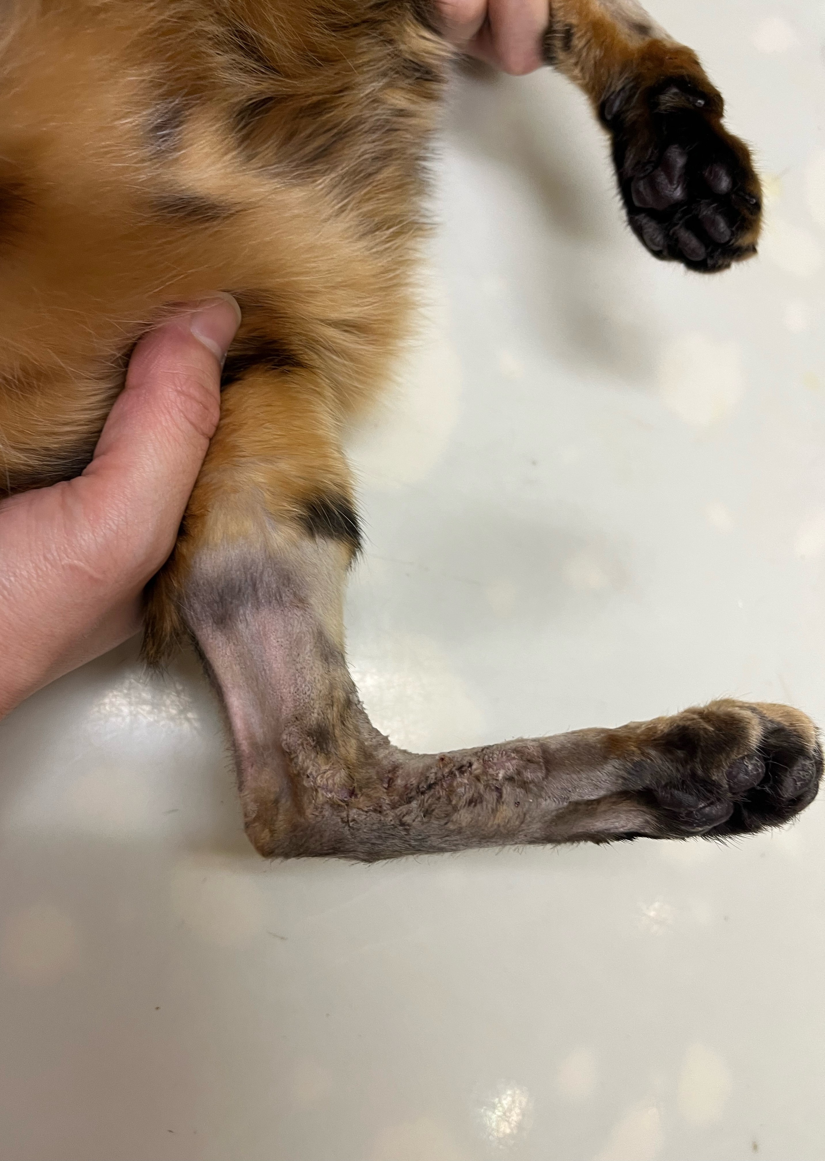 四肢にできた腫瘍(軟部組織肉腫)の日帰りレーザー手術をうけられたベンガル5歳女の子