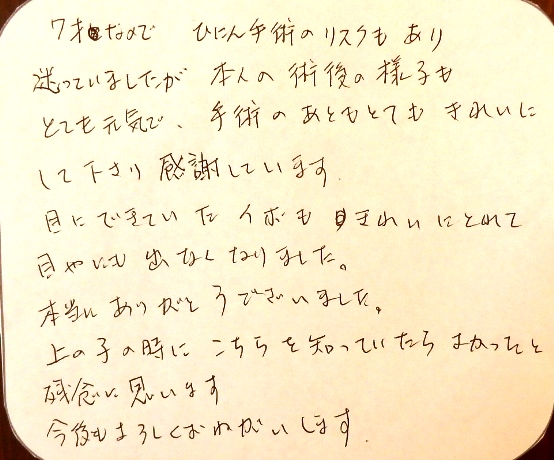 レーザーで出血や腫れ、痛みを最小限に抑え日帰りで手術ができました。