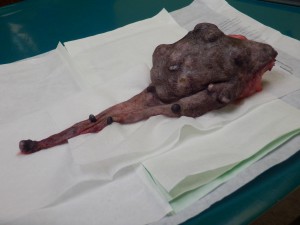 こちらが切除した腫瘍です。3キロちょっとの小さな体に約450gの大きな乳腺腫瘍ができていました。さぞ重かったことでしょう。