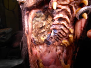 診察させていただくと、右側の頬が盛り上がっており、上の歯茎の右側あたりに真っ黒な腫瘍が大きくはびこってしまっていて、もうすでに腫瘍が壊死をおこし、腐ってしまっている状態でした。