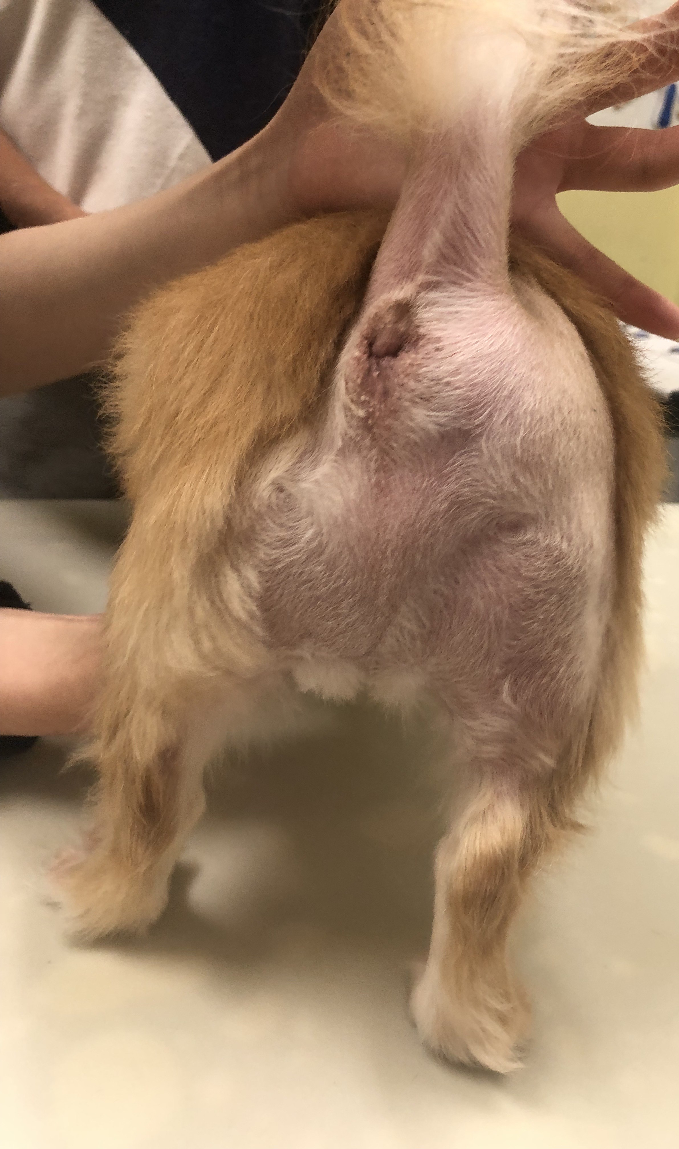 会陰ヘルニアになっているとかかりつけの病院でいわれたとご来院されました。診察させていただくと、やはり右側が会陰ヘルニアになっていました。