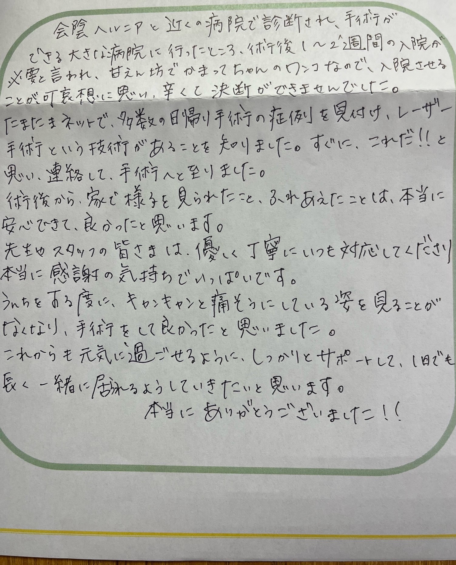 今回は会陰ヘルニアの整復手術と去勢手術をレーザーを用いて行いました。レーザー手術は無事に終わり、日帰りで元気に帰られました。翌日より食欲もあり、ウンチも自分でしっかりとだせるようになり何よりです。