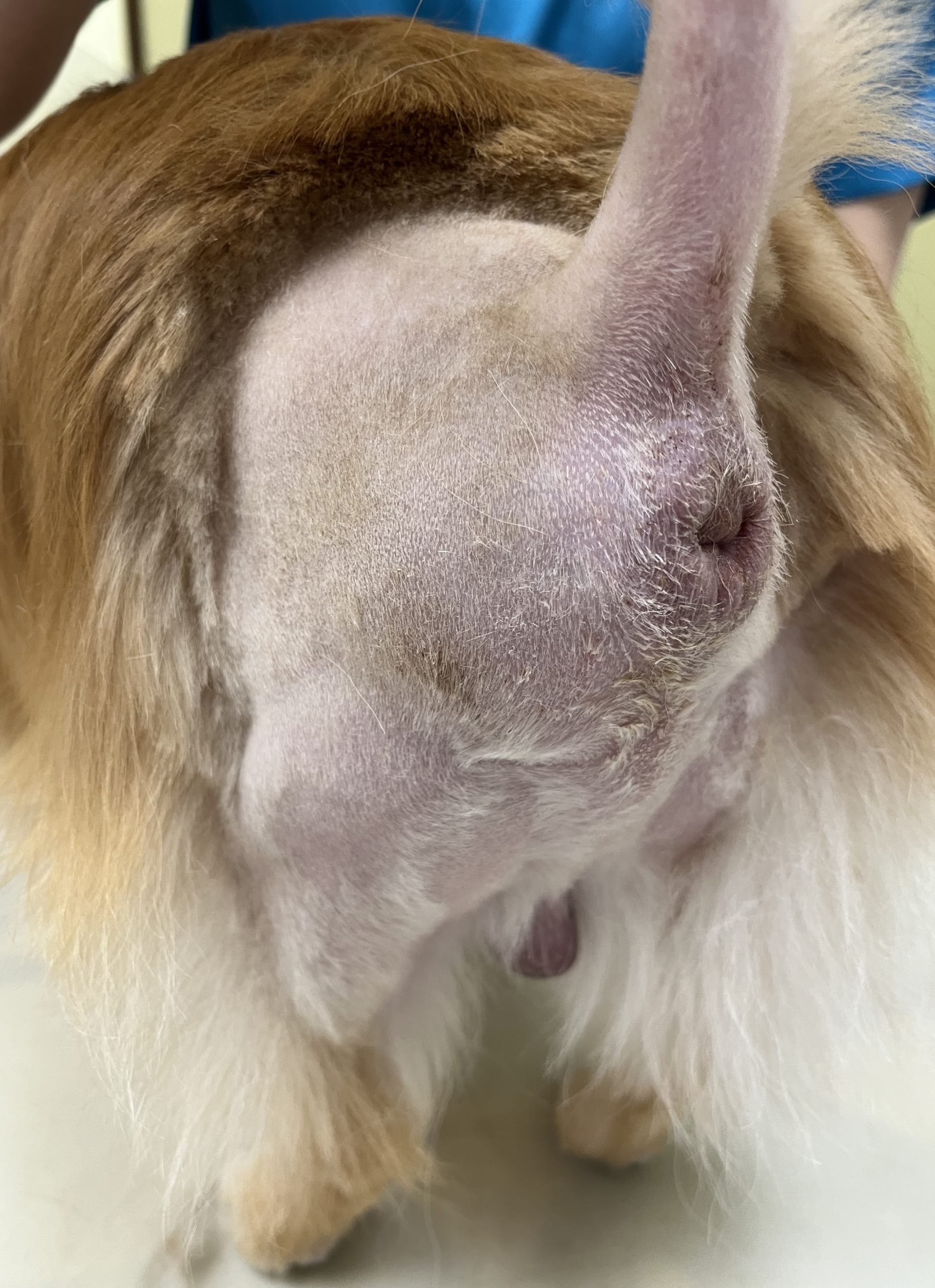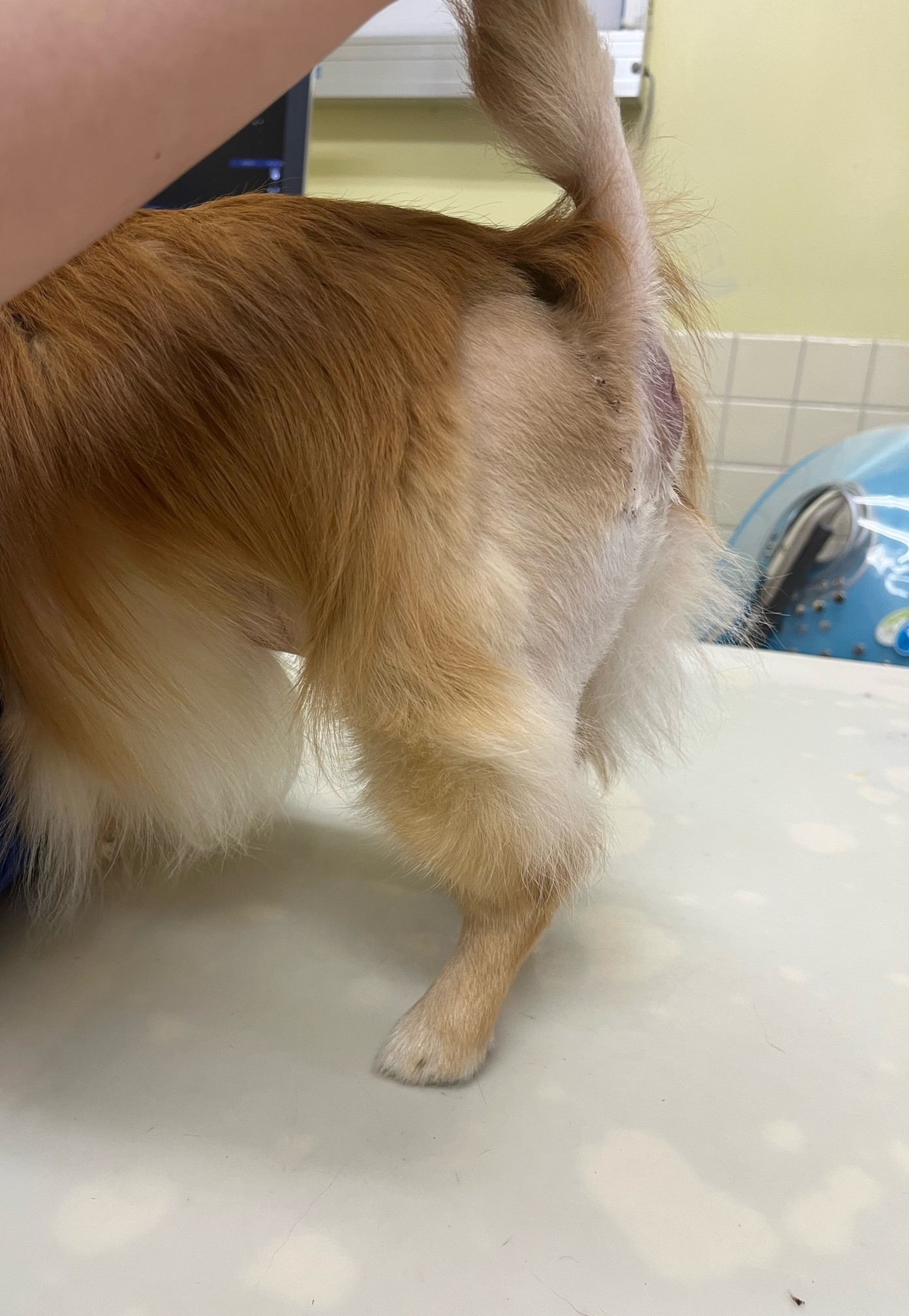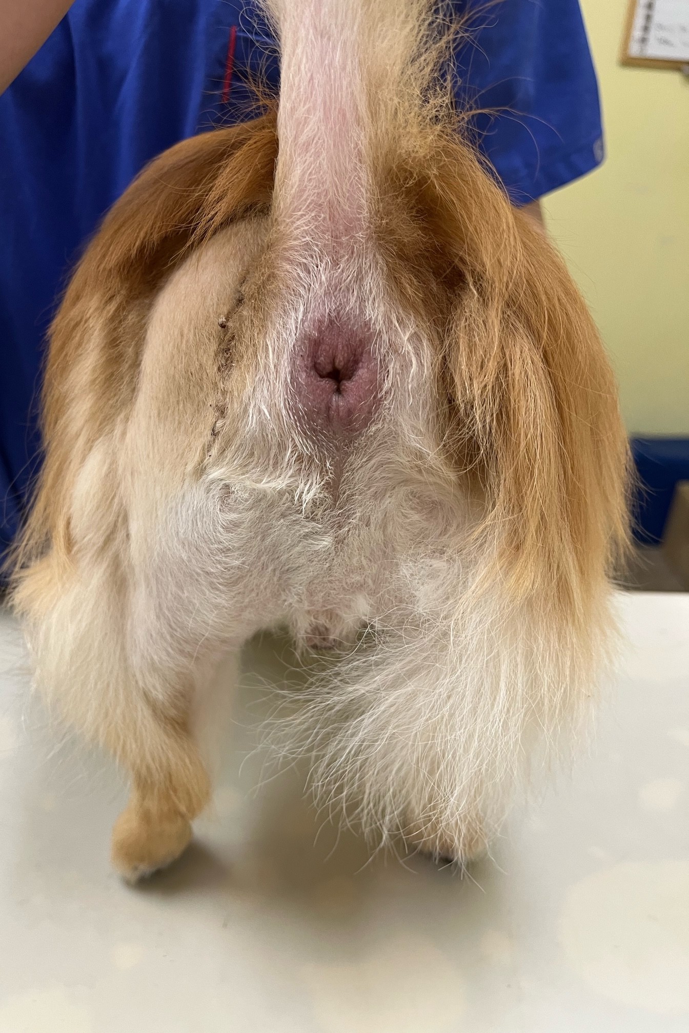診察させていただくと、会陰ヘルニアという病気を引き起こしてしまい便がおしりに溜まって腫れてしまっていました。