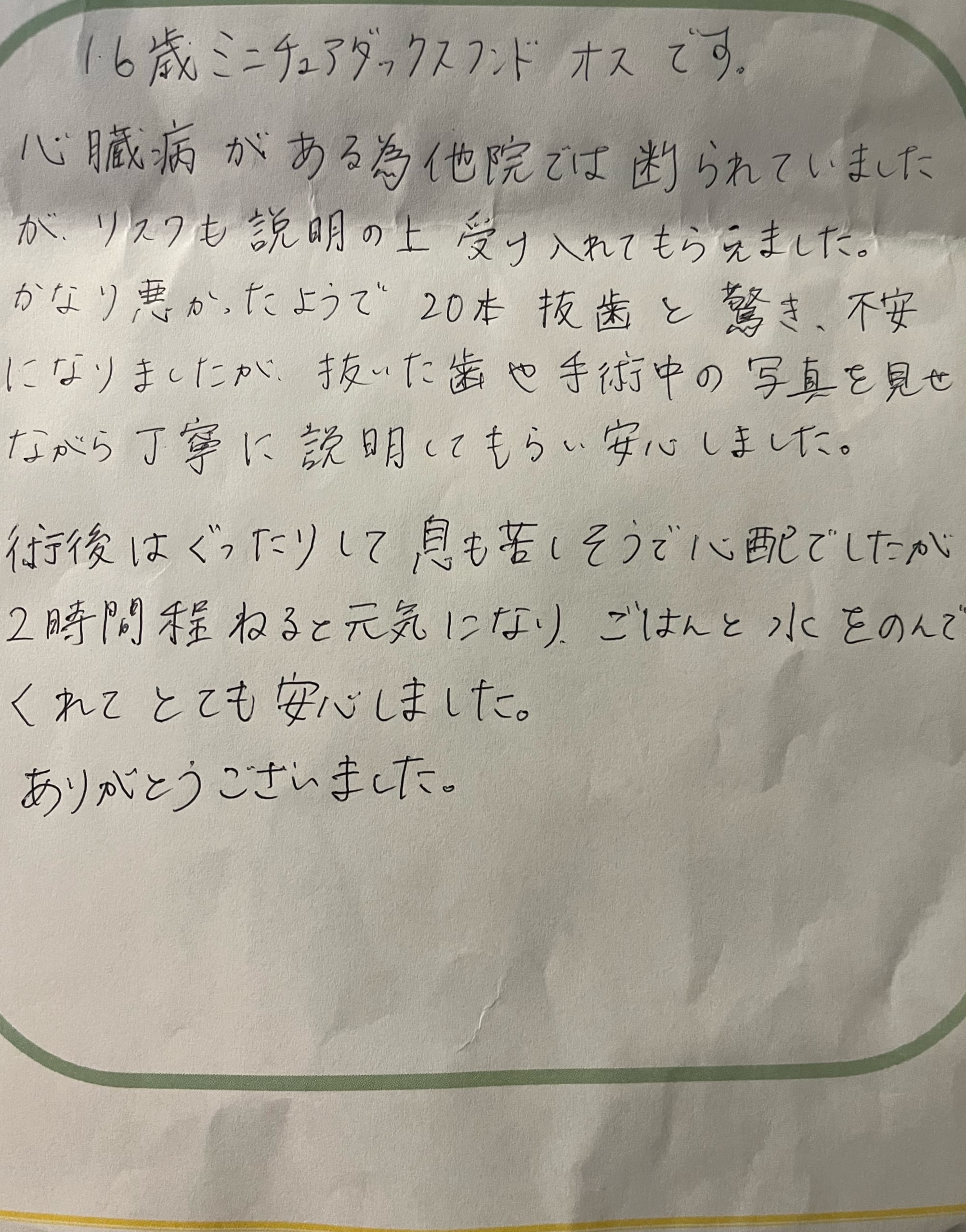 術後は大きな合併症もなく、手術当日夜も手術前よりご飯がしっかり食べれて、翌日もしっかりしていますと飼い主様も安心されていました。
