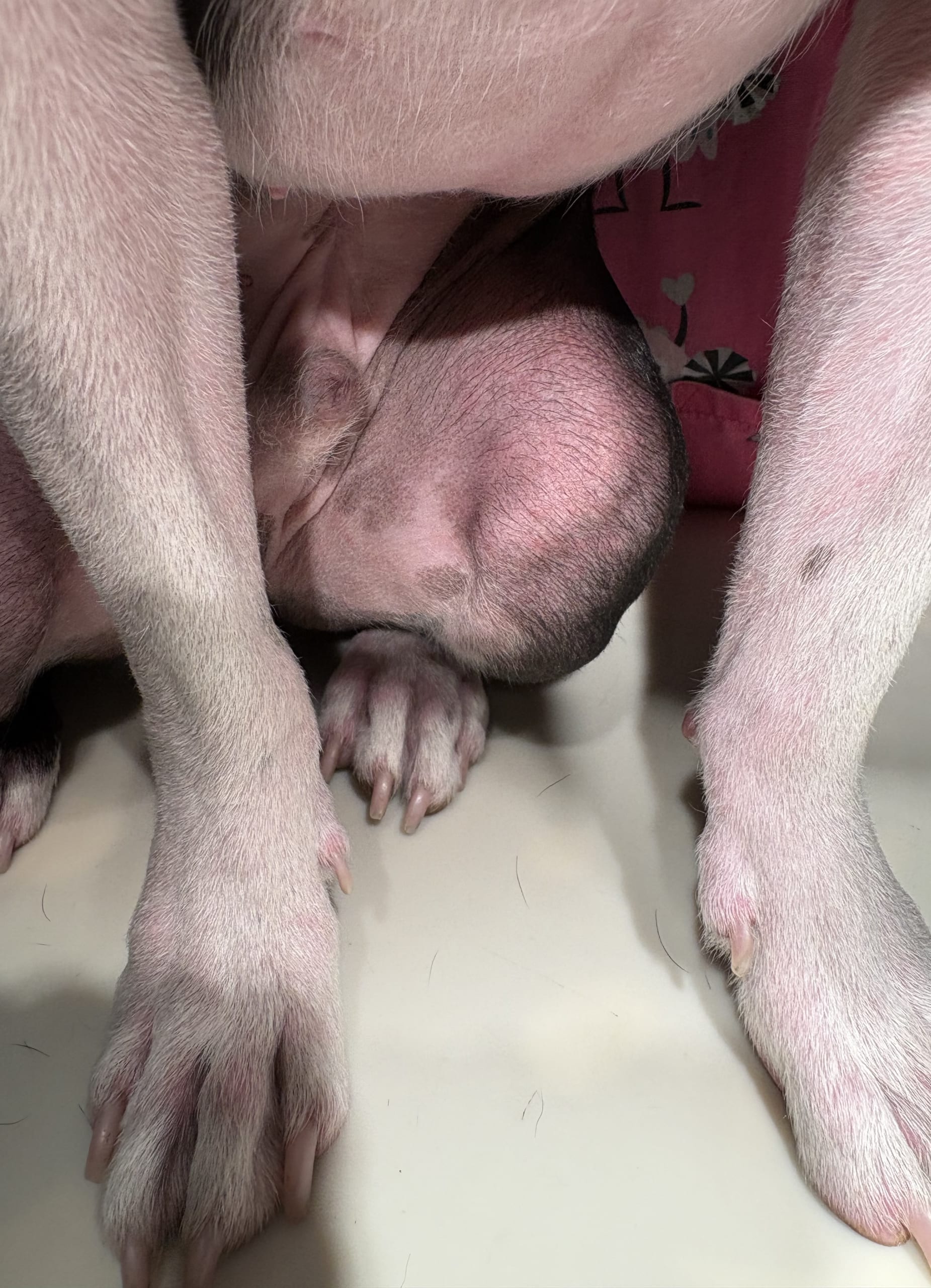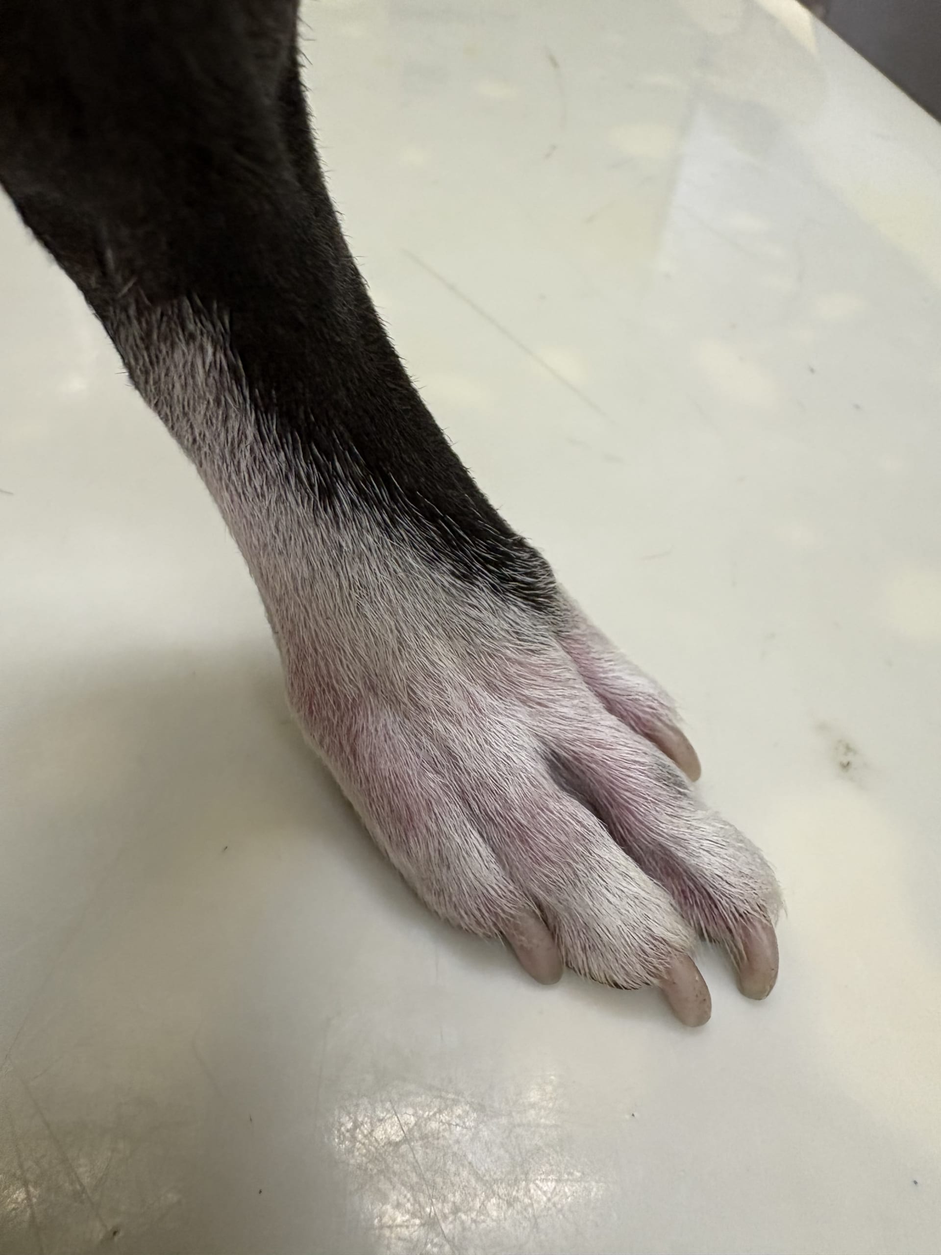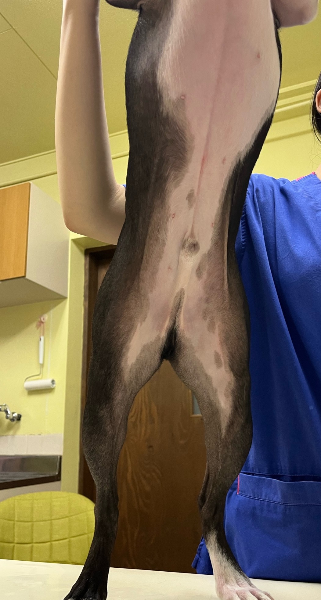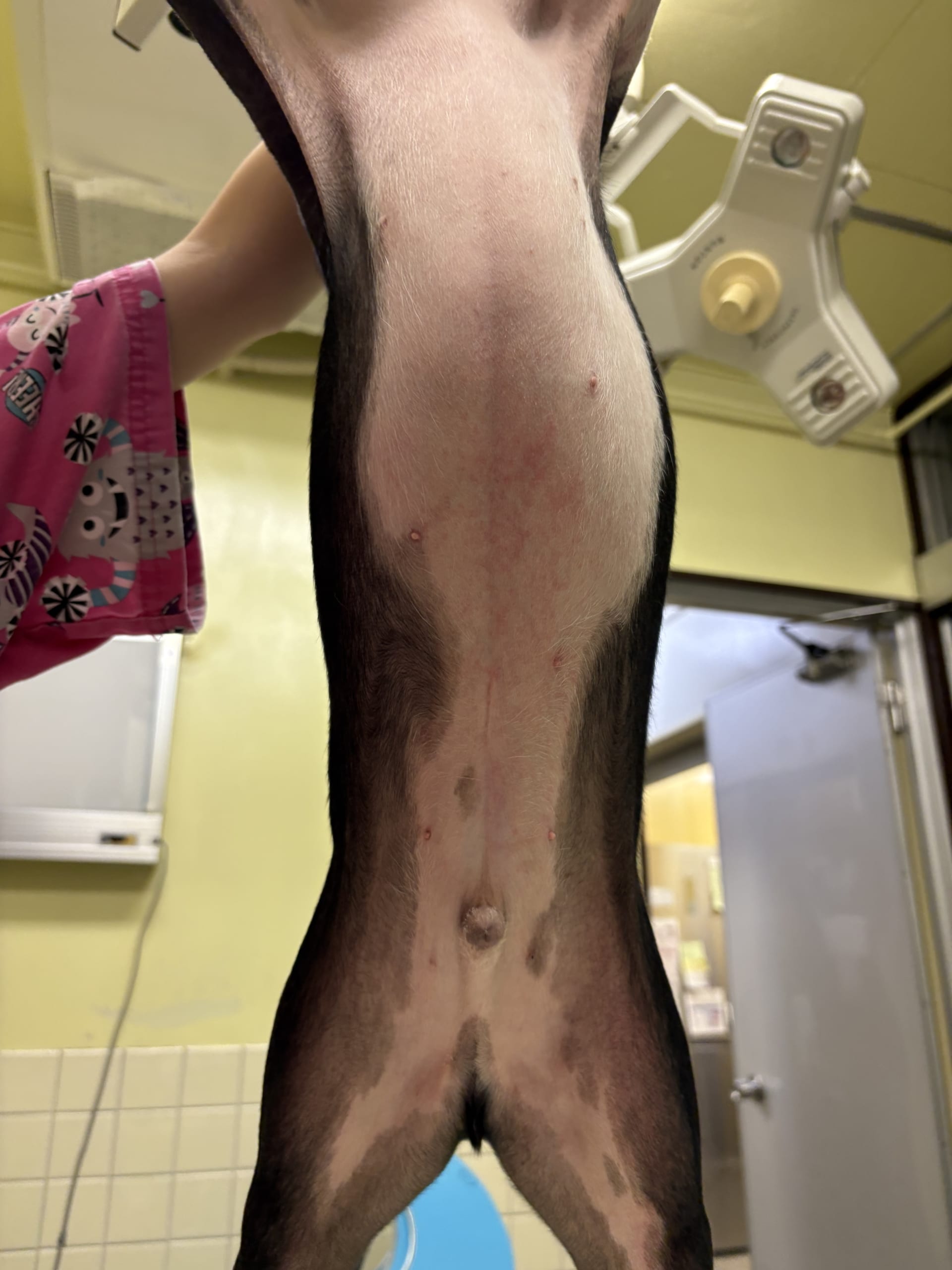診察させていただくと、全身が炎症をおこしあかくなり、湿疹が背中側、お腹側顔回りにわたり湿疹ができてしまって、とても痒そうにしていました。