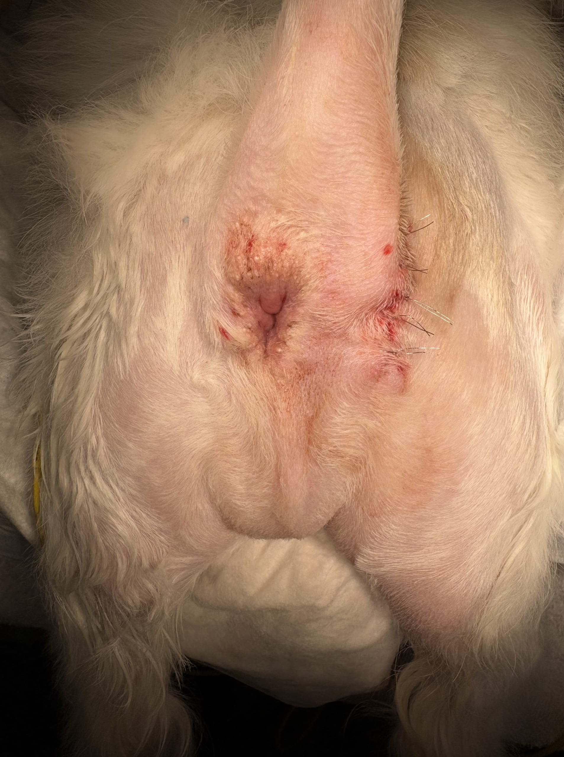 数年前に当院にて左側の会陰ヘルニアの日帰りレーザー手術をうけられました。今回は反対側の右側が会陰ヘルニアになった為、会陰ヘルニアの日帰りレーザー手術をおこないました。