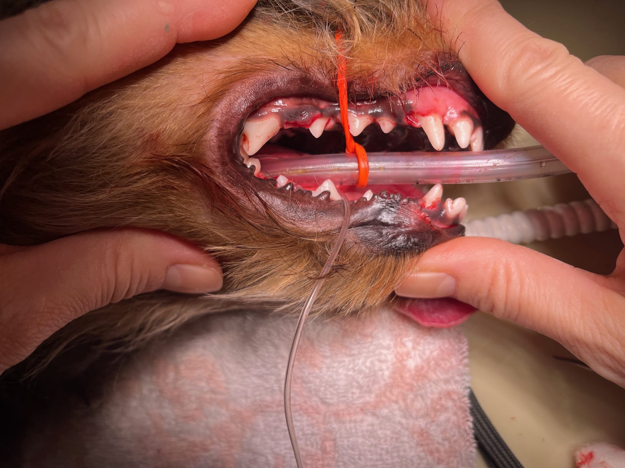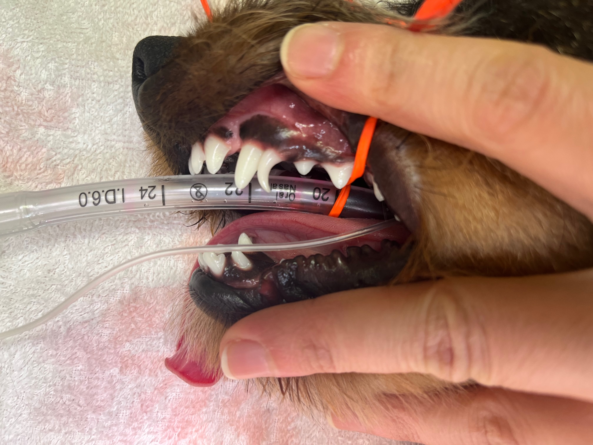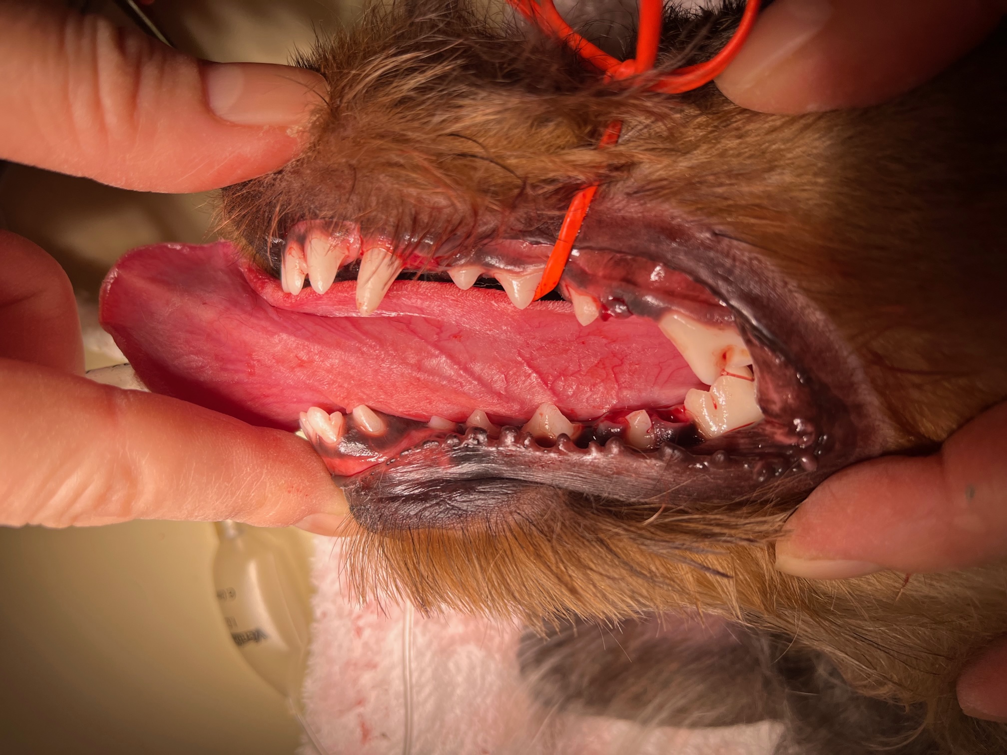 乳歯が抜けずに犬歯や奥歯に残ったまま永久歯が生えていました。今回は去勢手術と同時に乳歯を7本抜歯しました。