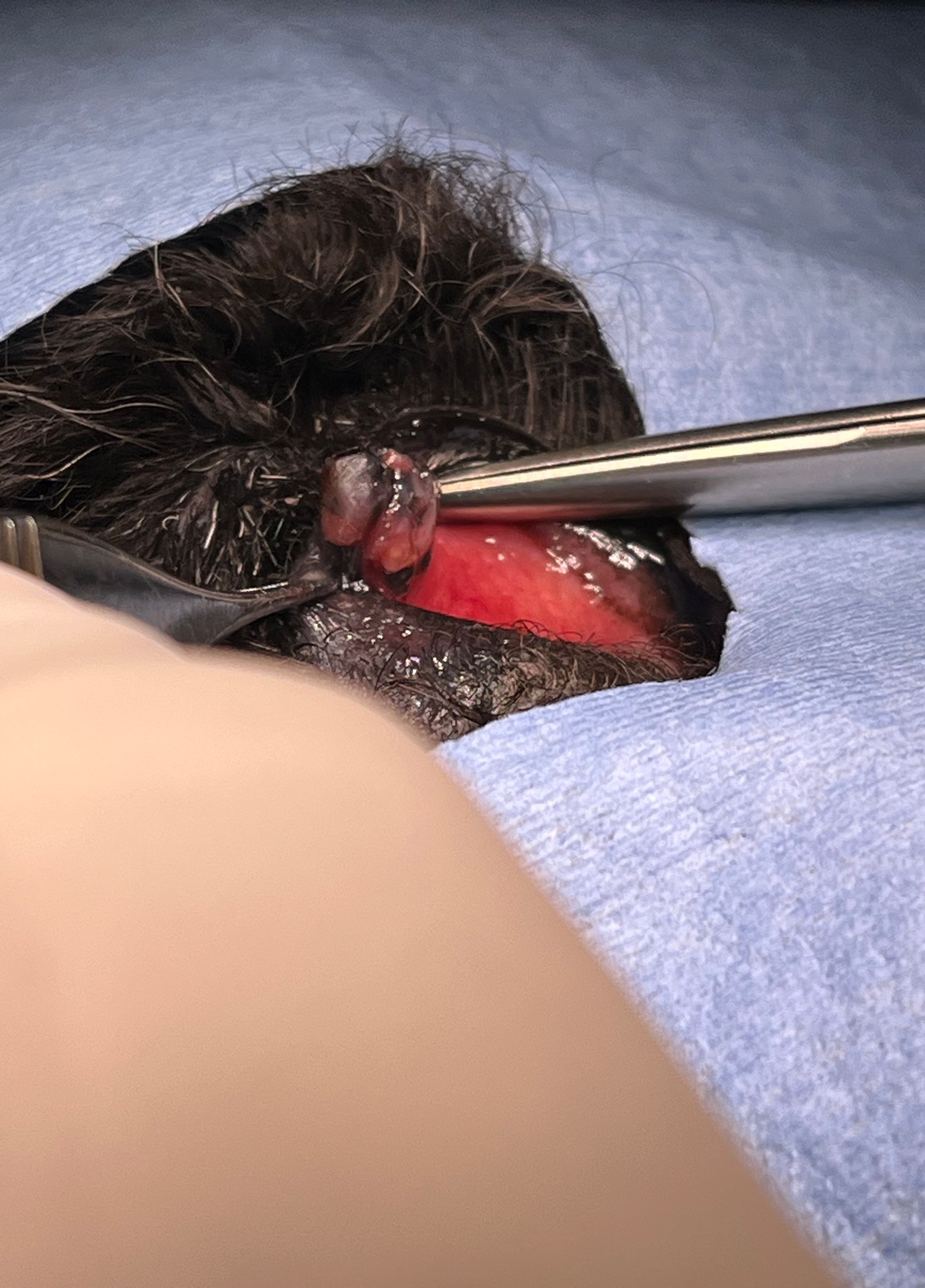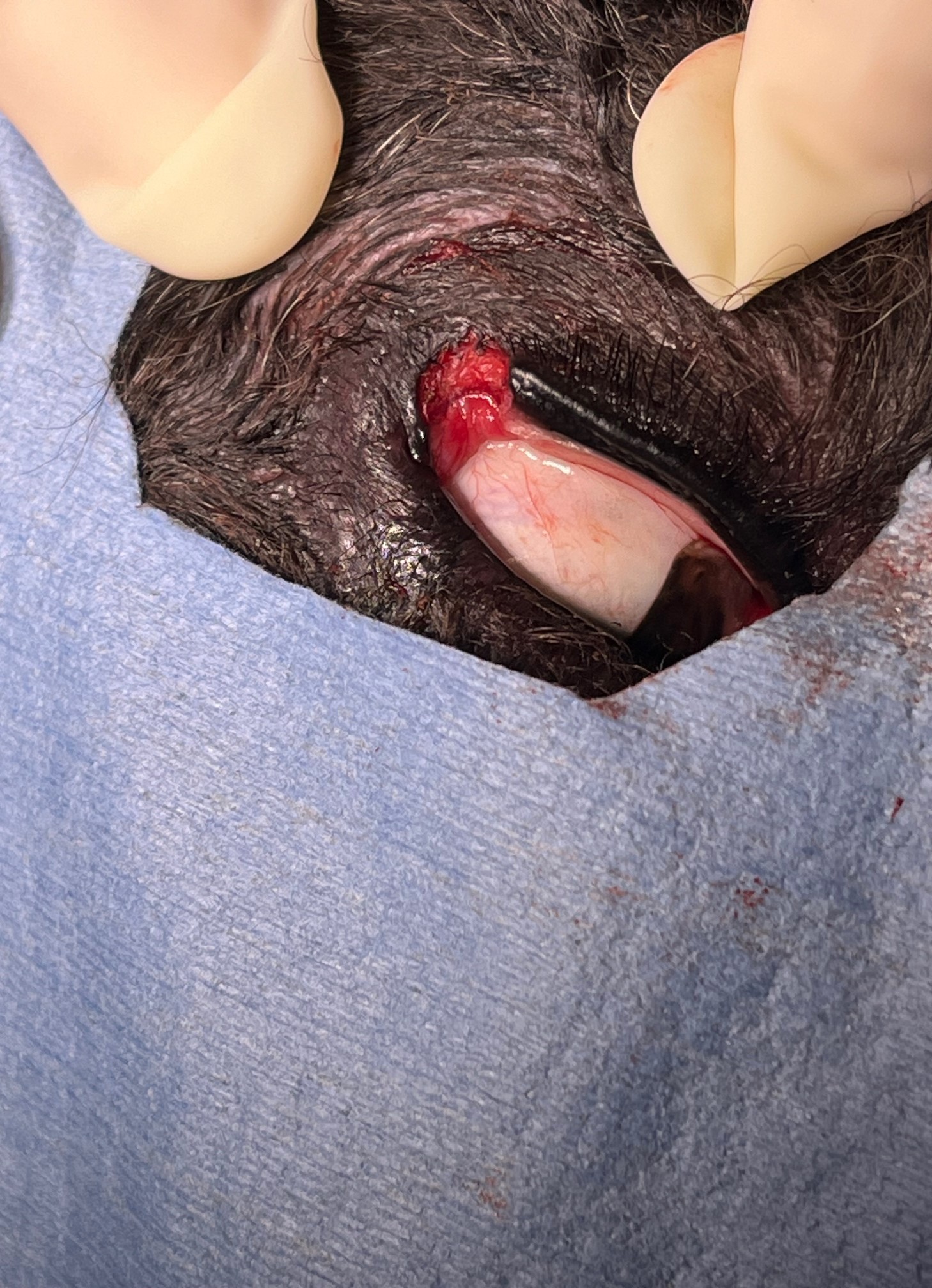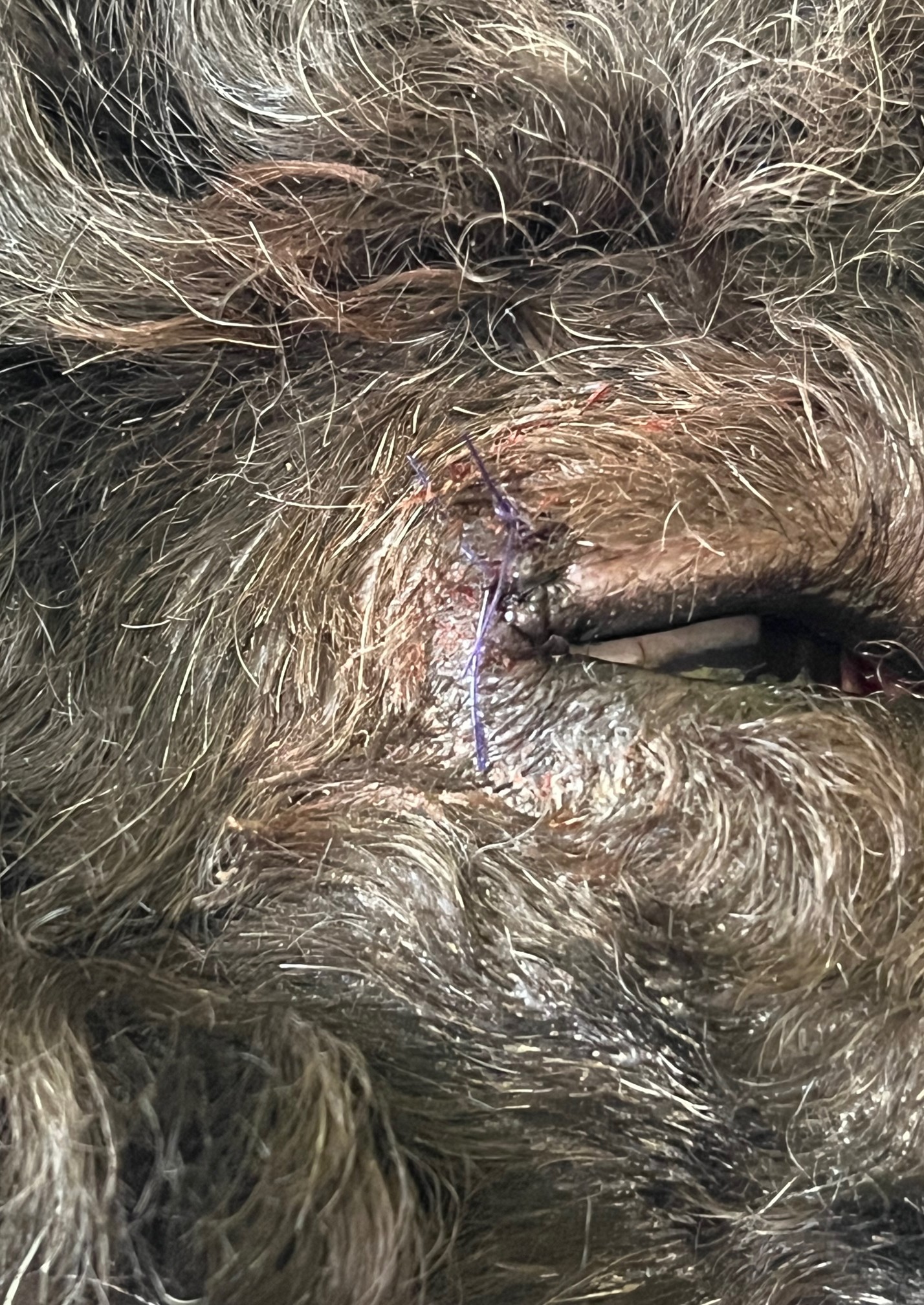 今回はレーザーを用いて腫瘤を眼瞼ごと切除し、眼瞼のふちをずれないよう、また縫合糸が目の表面に出ないようにきをつけて縫合しました。