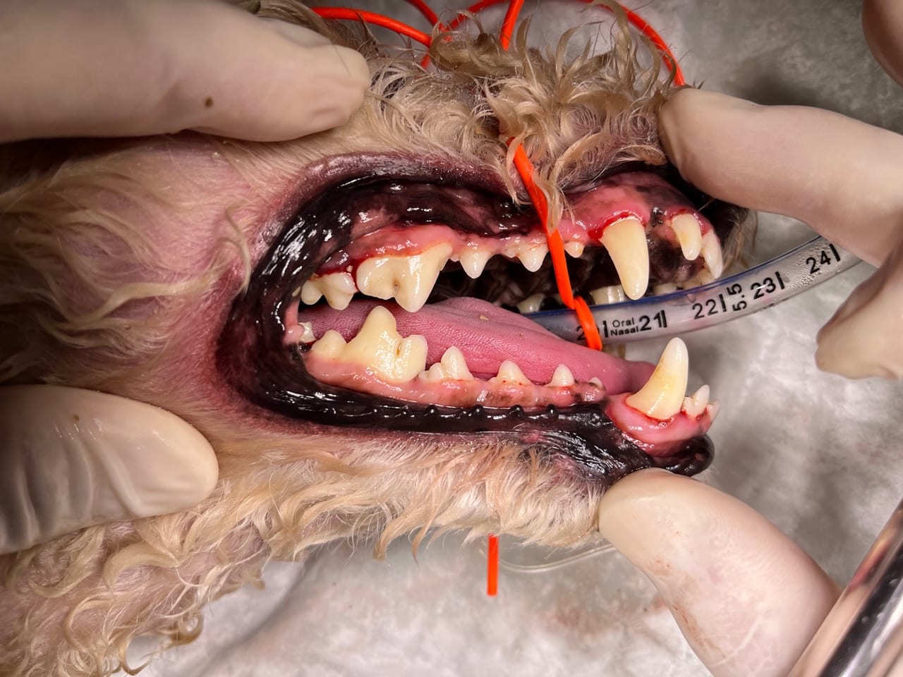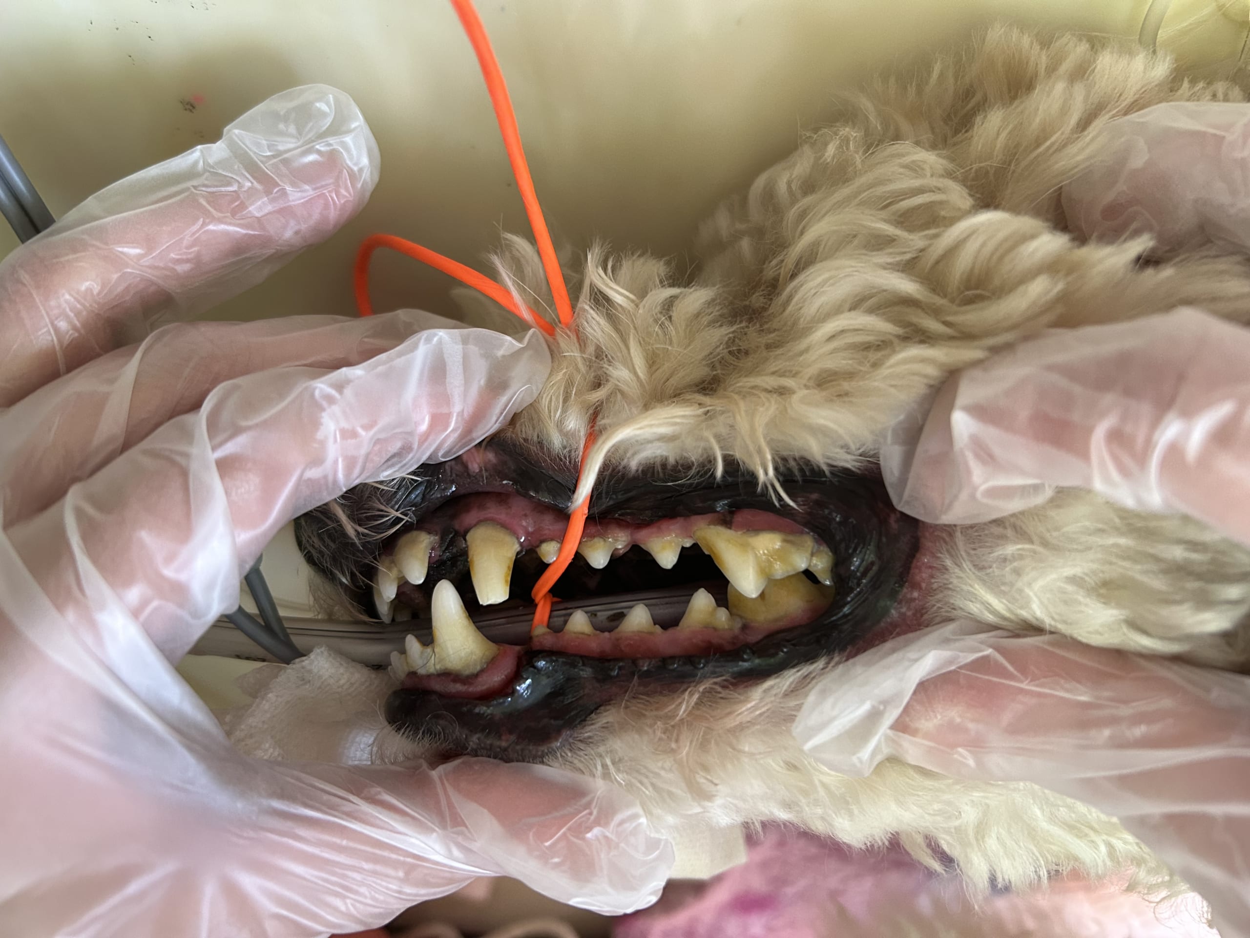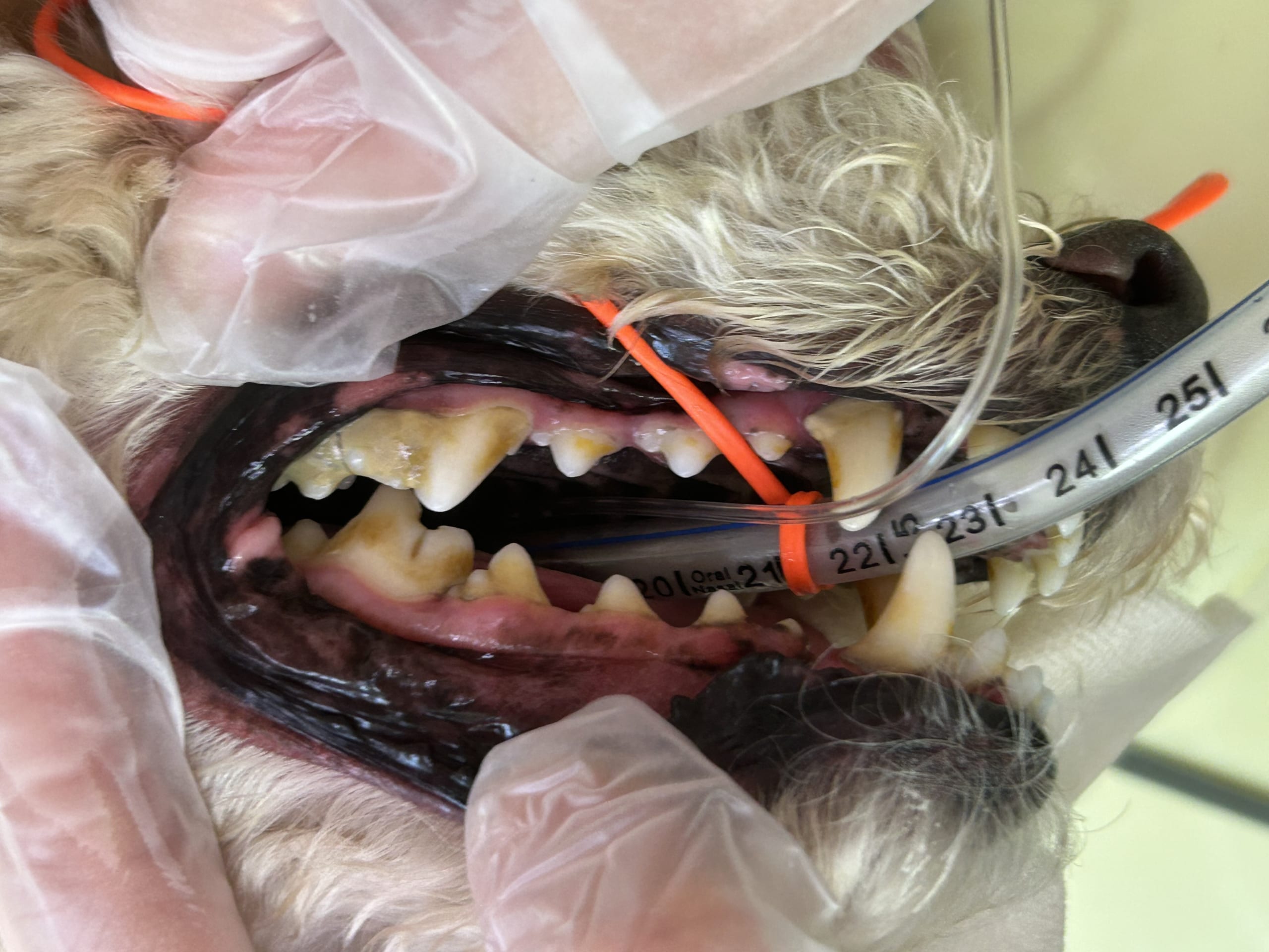 レーザーを用いて手術を行い膀胱から結石を取り出し歯石取りも同時におこないました。