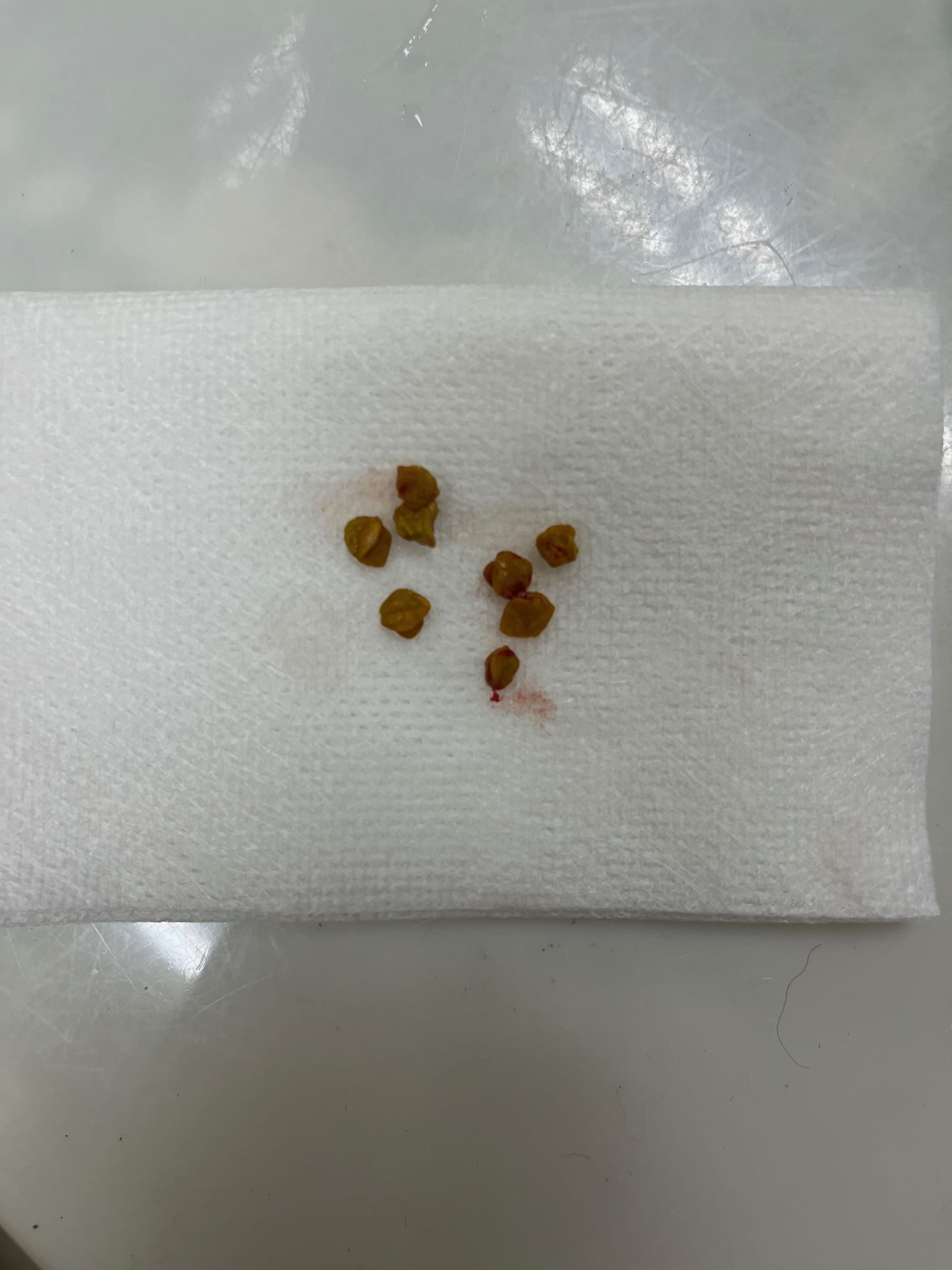 レーザーにて手術をおこない無事に膀胱からたくさんの膀胱結石を取り出しました。乳腺腫瘍と皮膚腫瘤も同時に摘出し、歯石取りもおこないました。