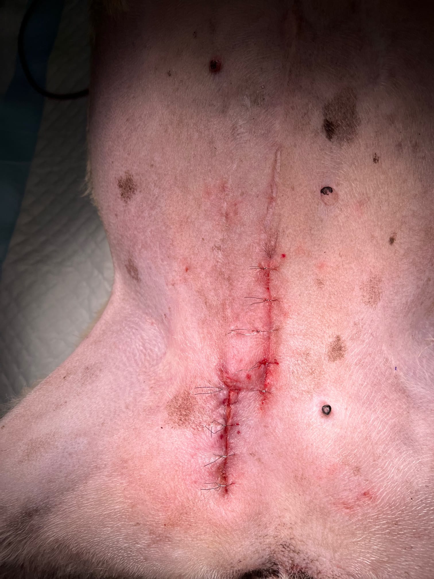 膀胱に結石ができてしまい何度か失禁や頻尿、膀胱炎を繰り返していました。年齢的なこともあり手術をどうしようかと飼い主様も考えられていました。しかし、以前乳腺癌の手術をしたこともあり今回別の場所に乳腺腫瘍もできてしまったことから手術にふみきられました。