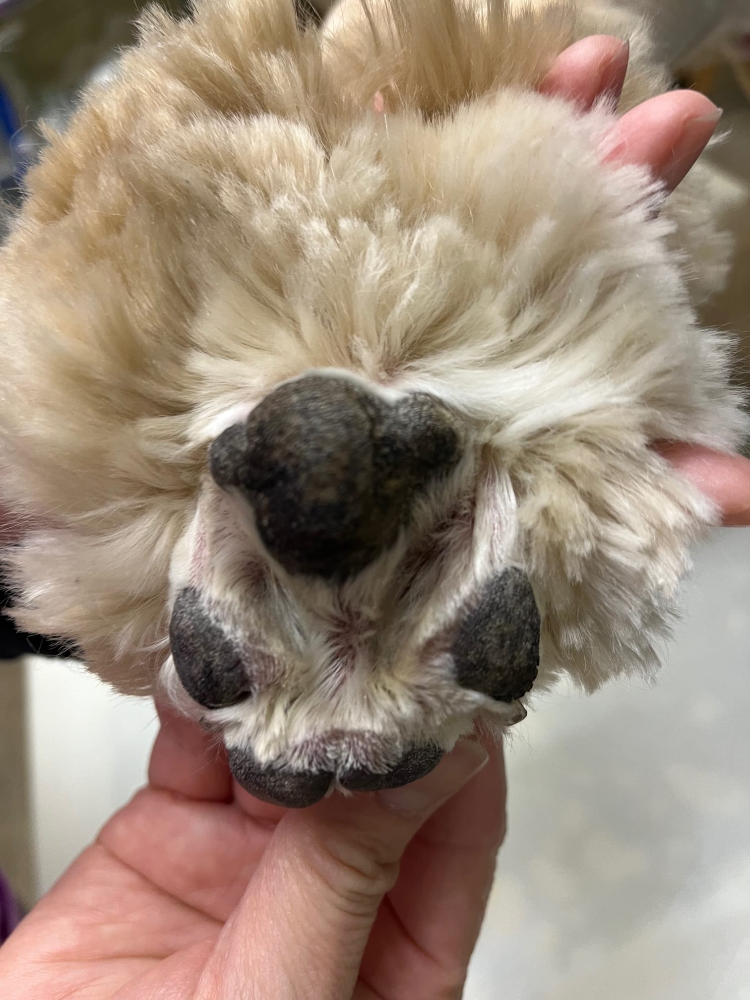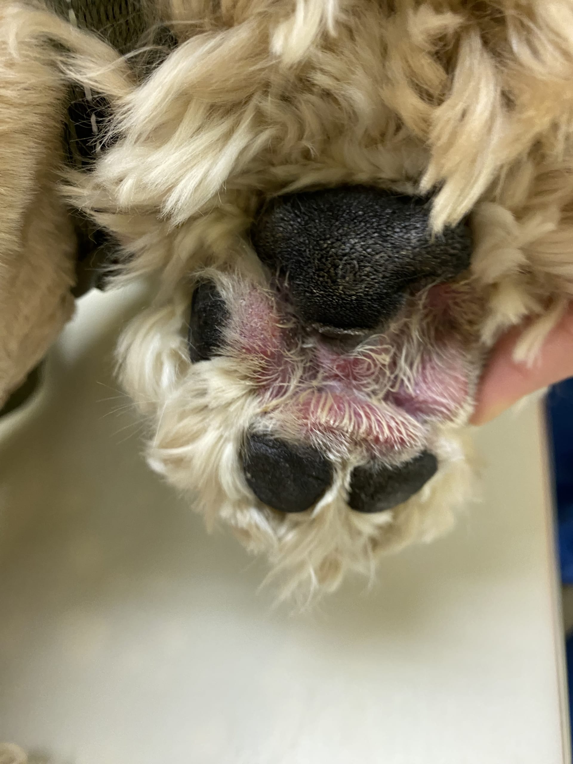 足の裏をずっと舐めてしまって真っ赤になっているとご来院されました。四肢すべての足の裏を舐め壊して真っ赤に炎症をおこしていました。通われているトリミングの後から舐めだしてしまったそうです。