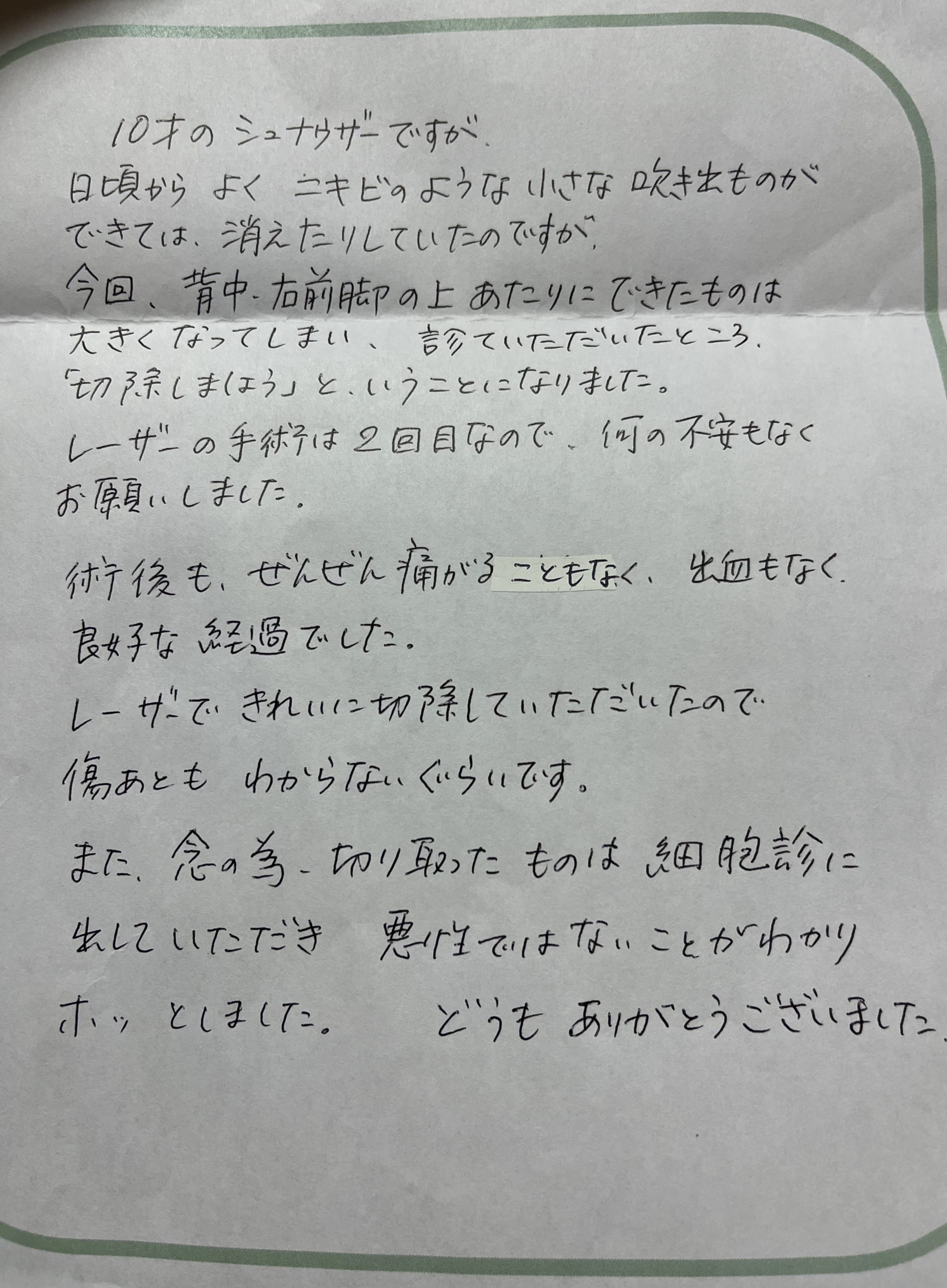 局所麻酔のよる体表腫瘤切除の日帰りレーザー手術をうけられた10歳のミニチュアシュナウザーの男の子