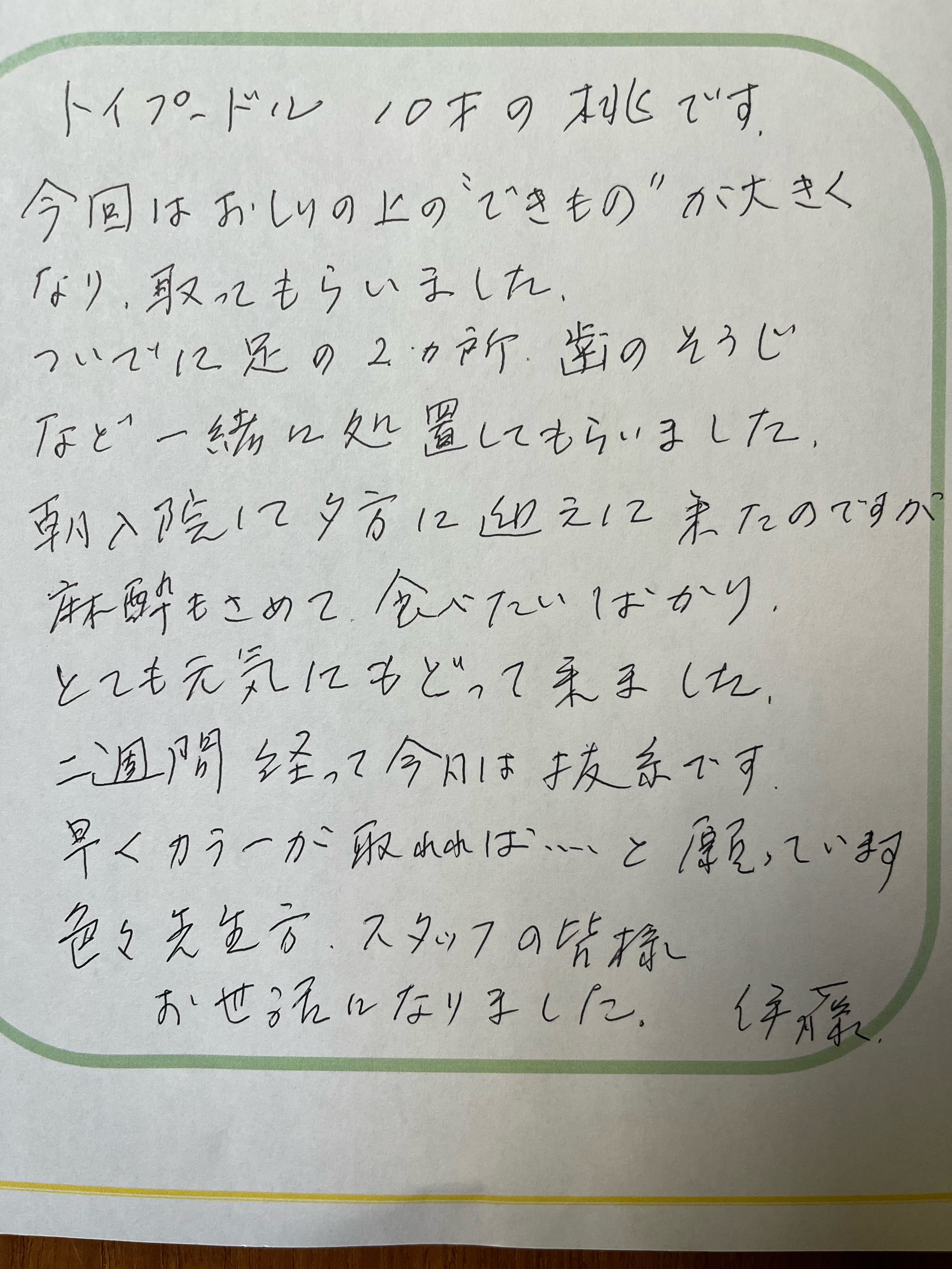 四肢や腰にできた体表腫瘤のレーザー日帰り手術と歯石取りをうけられた10歳トイプードル女の子